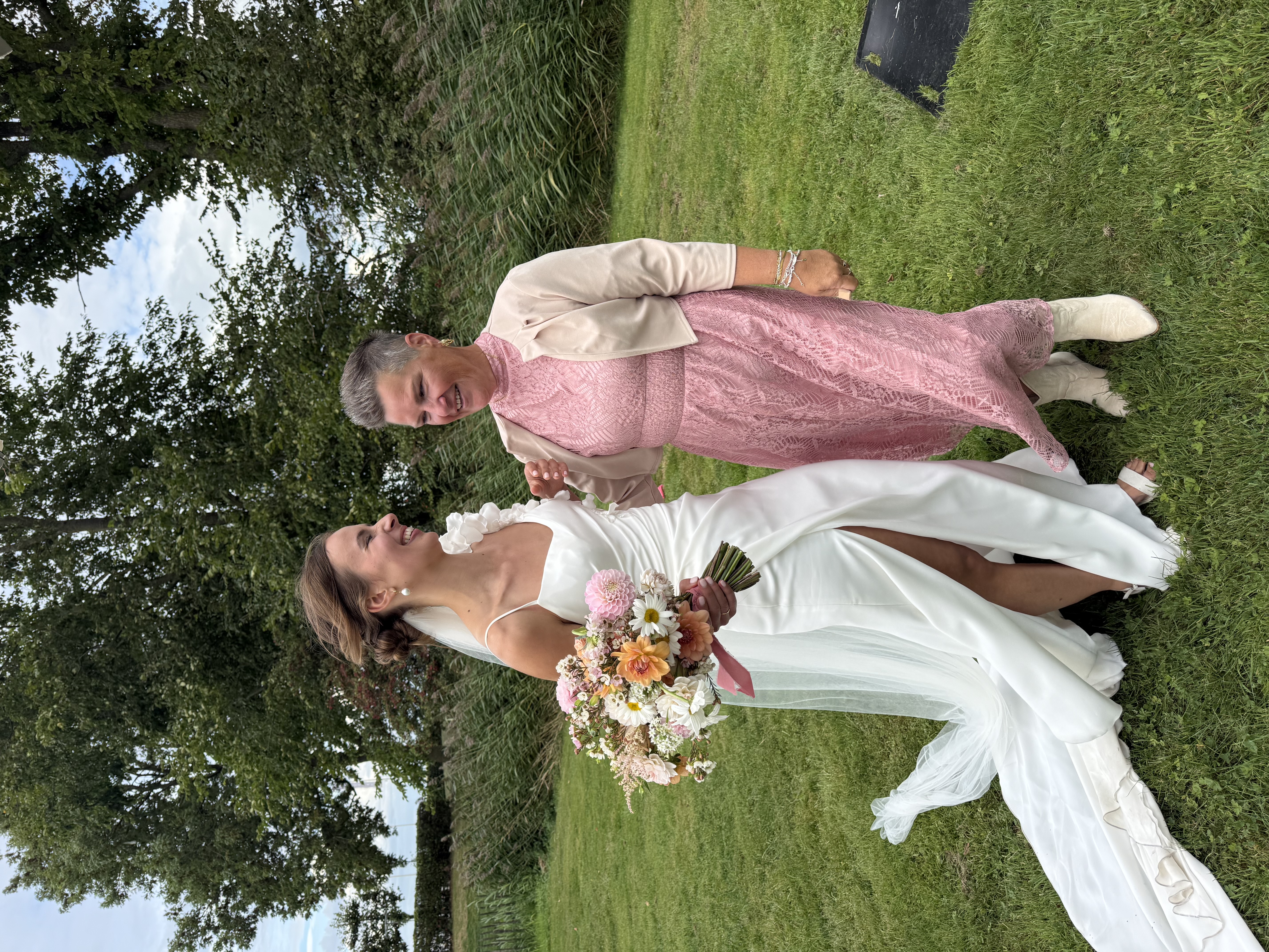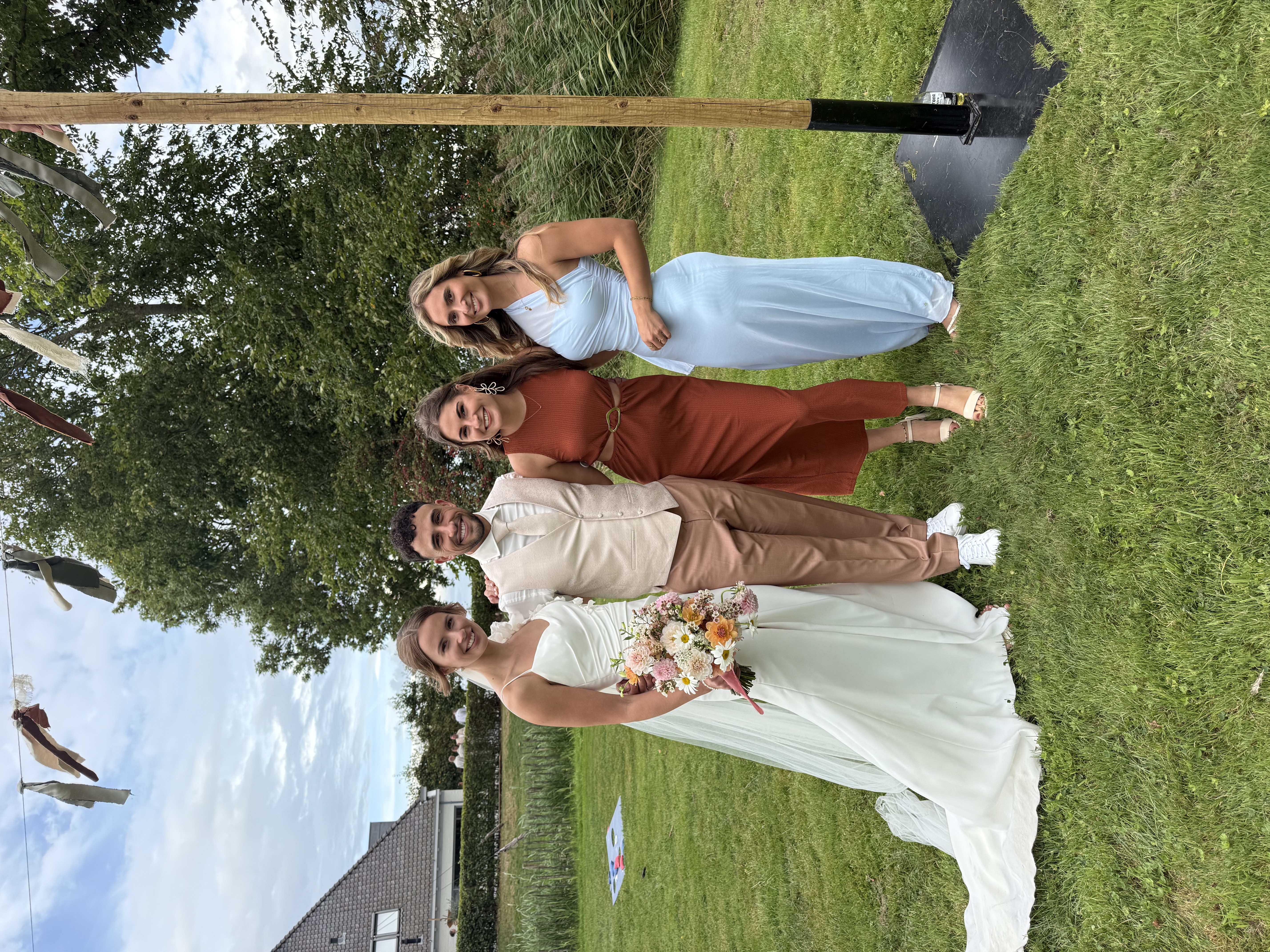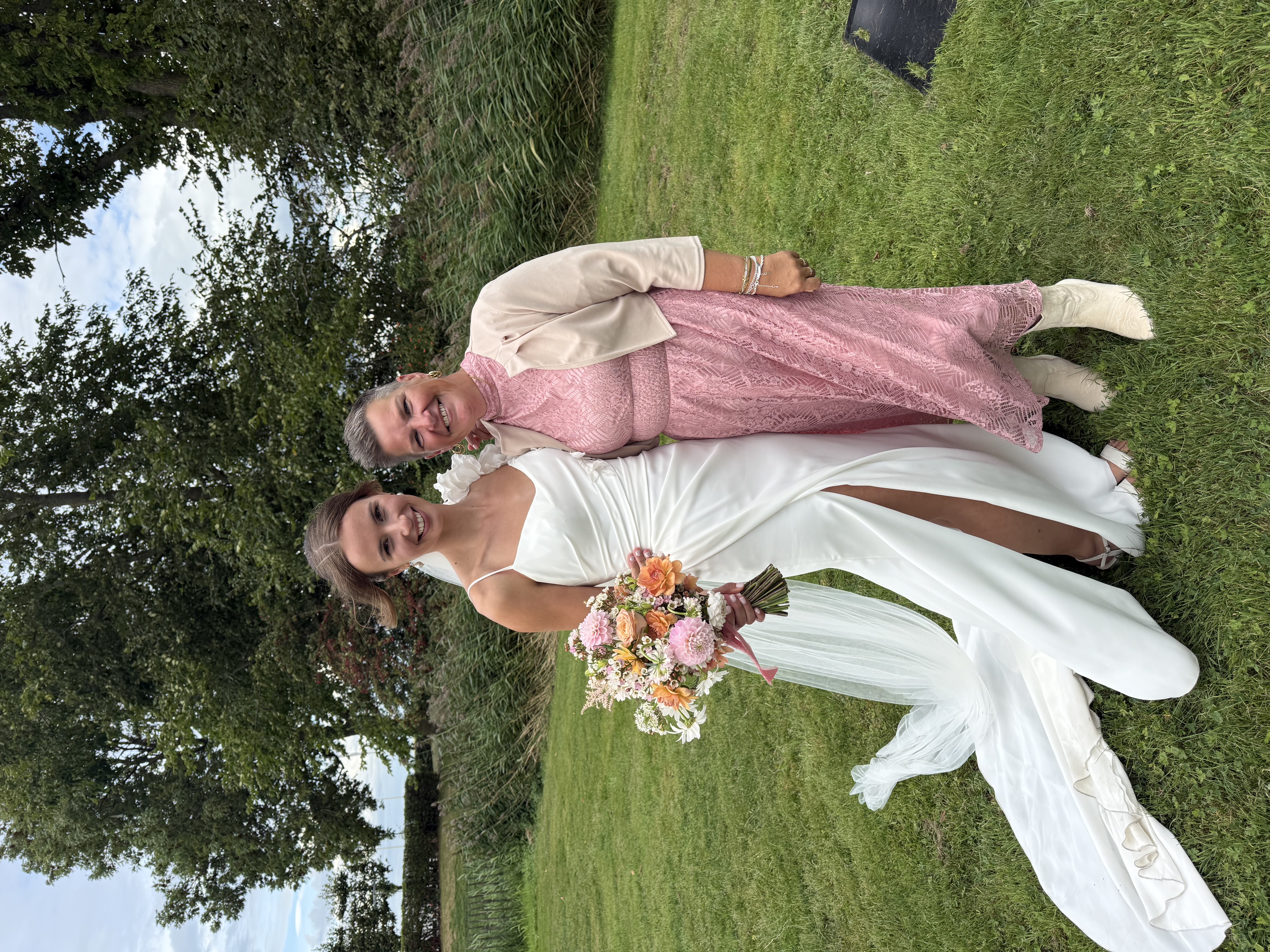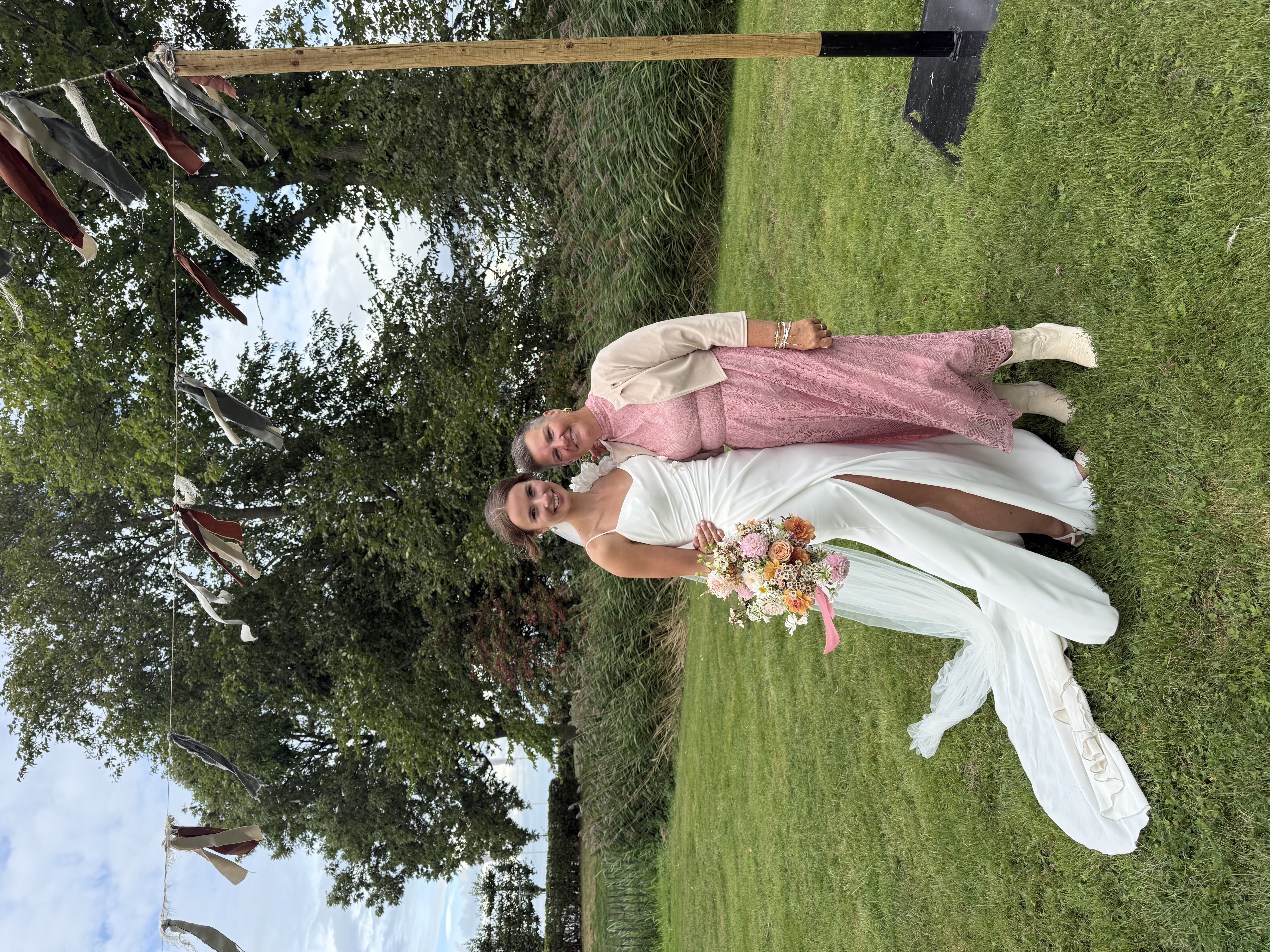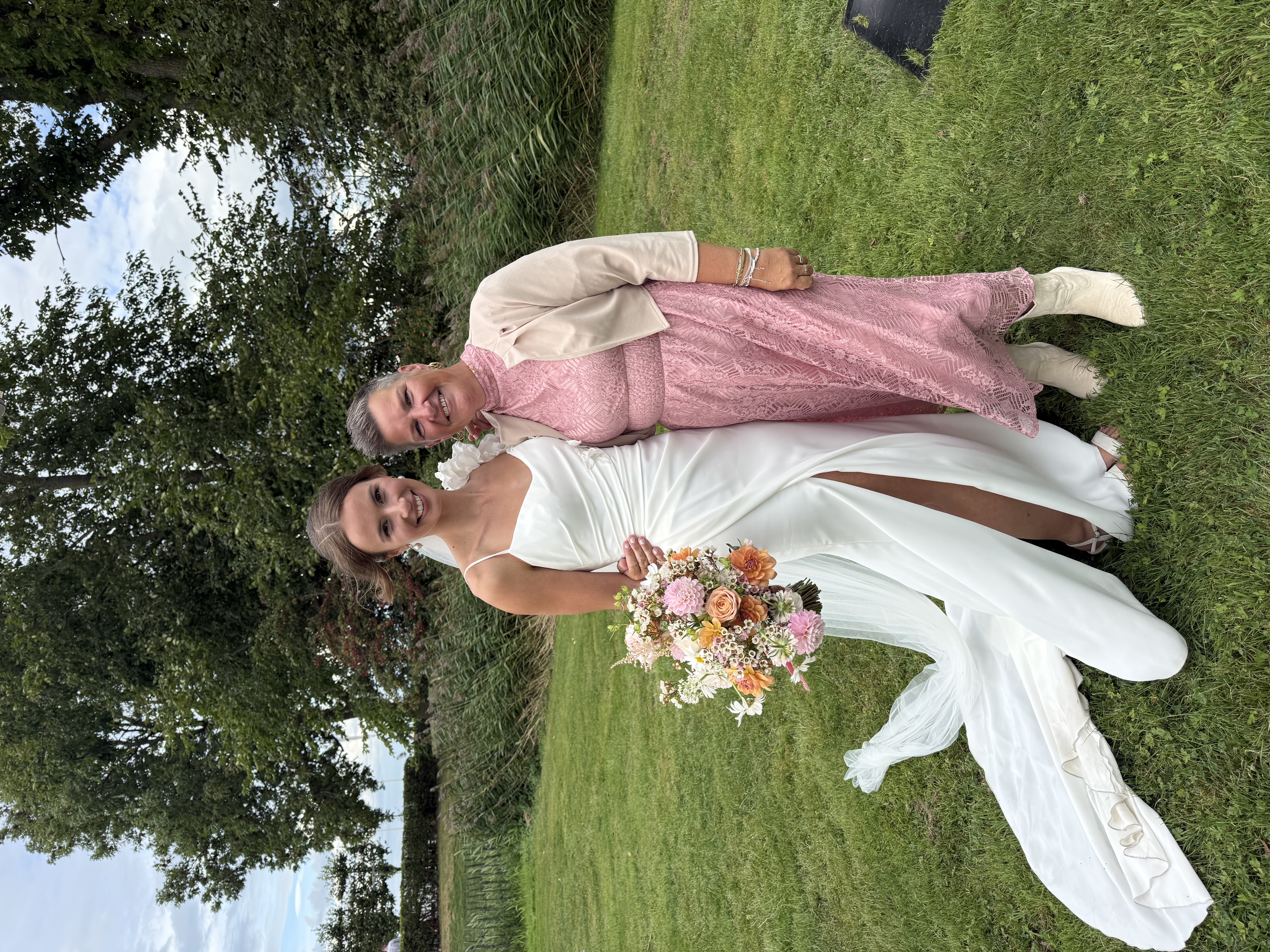 Onze bruiloft wordt een feest vol warmte, gezelligheid en stijl – een perfecte mix van festival vibes en chique details. Denk aan zachte aardetinten, warme perziktinten en natuurlijke groentinten, gecombineerd met romantische pastelkleuren. Alles komt samen in een ontspannen, elegante sfeer waarin iedereen zich vrij voelt om te genieten, te dansen en te vieren. Wil je qua kleding aansluiten bij onze stijl? Ga dan voor zachte en warme tinten zoals roest, perzik, oudroze, saliegroen of mint. Geen felle kleuren of zwart-wit, maar een palet dat perfect past bij de natuurlijke en feestelijke setting van de dag. We kijken er enorm naar uit om dit bijzondere moment met jullie te delen!