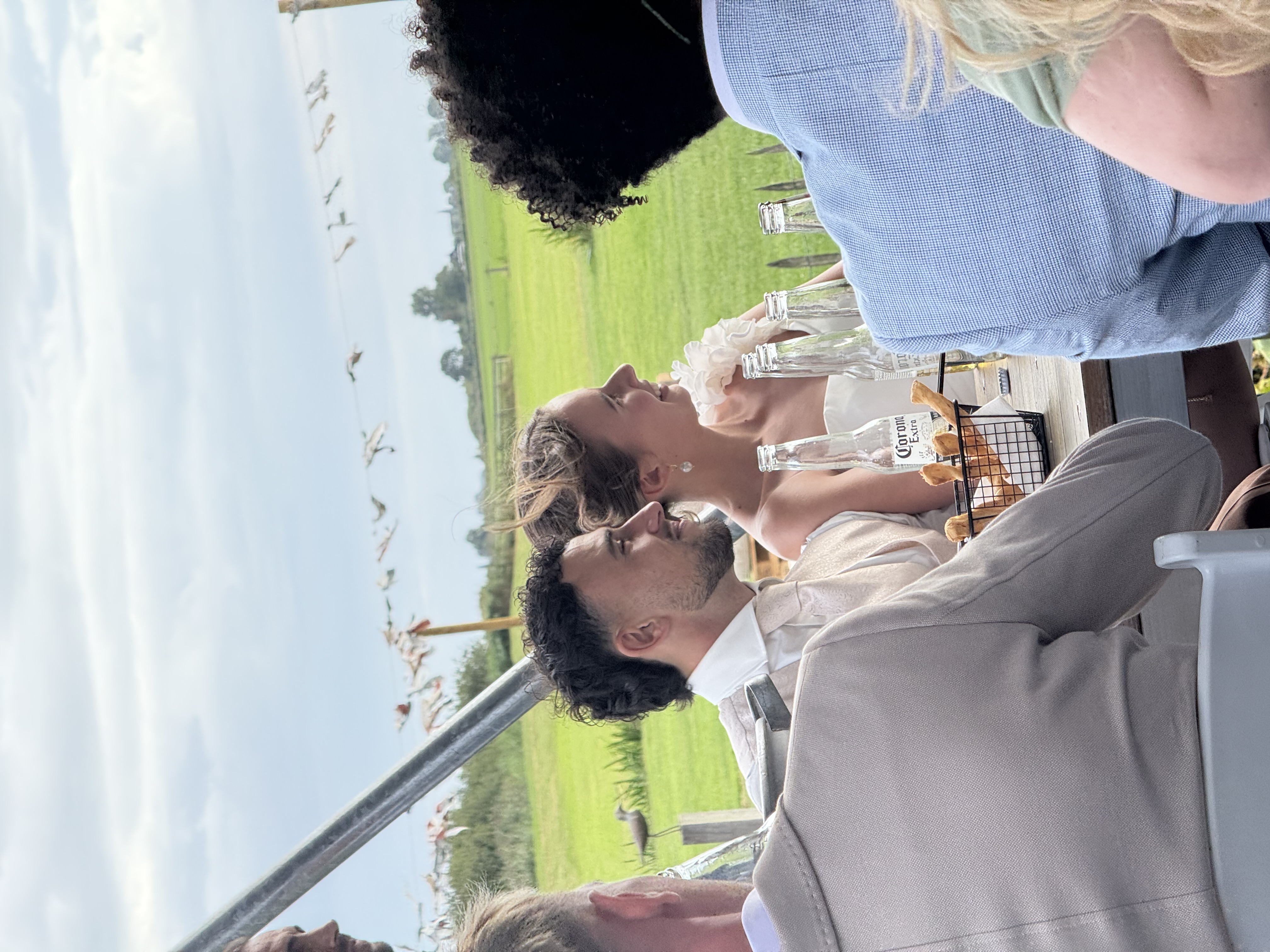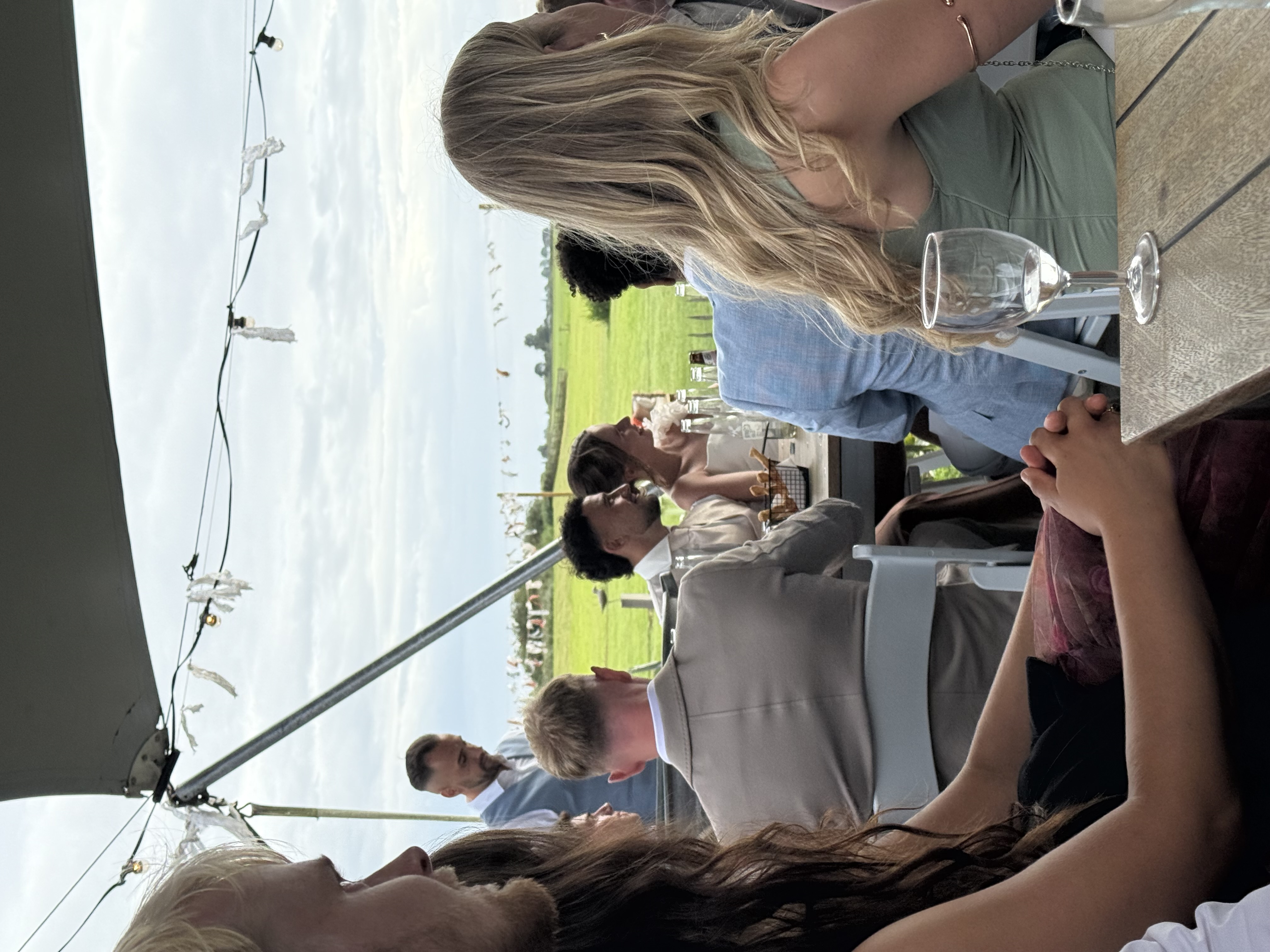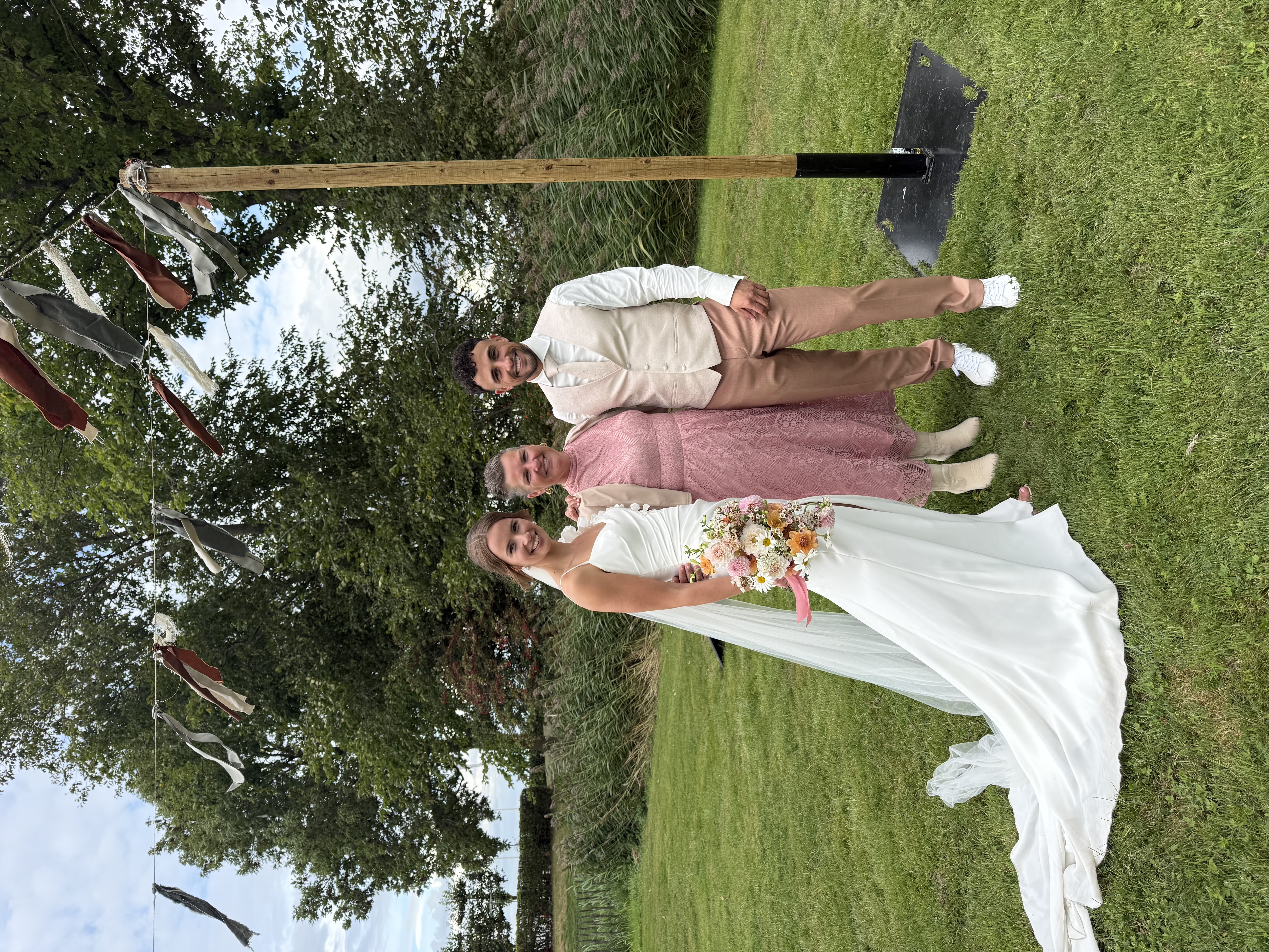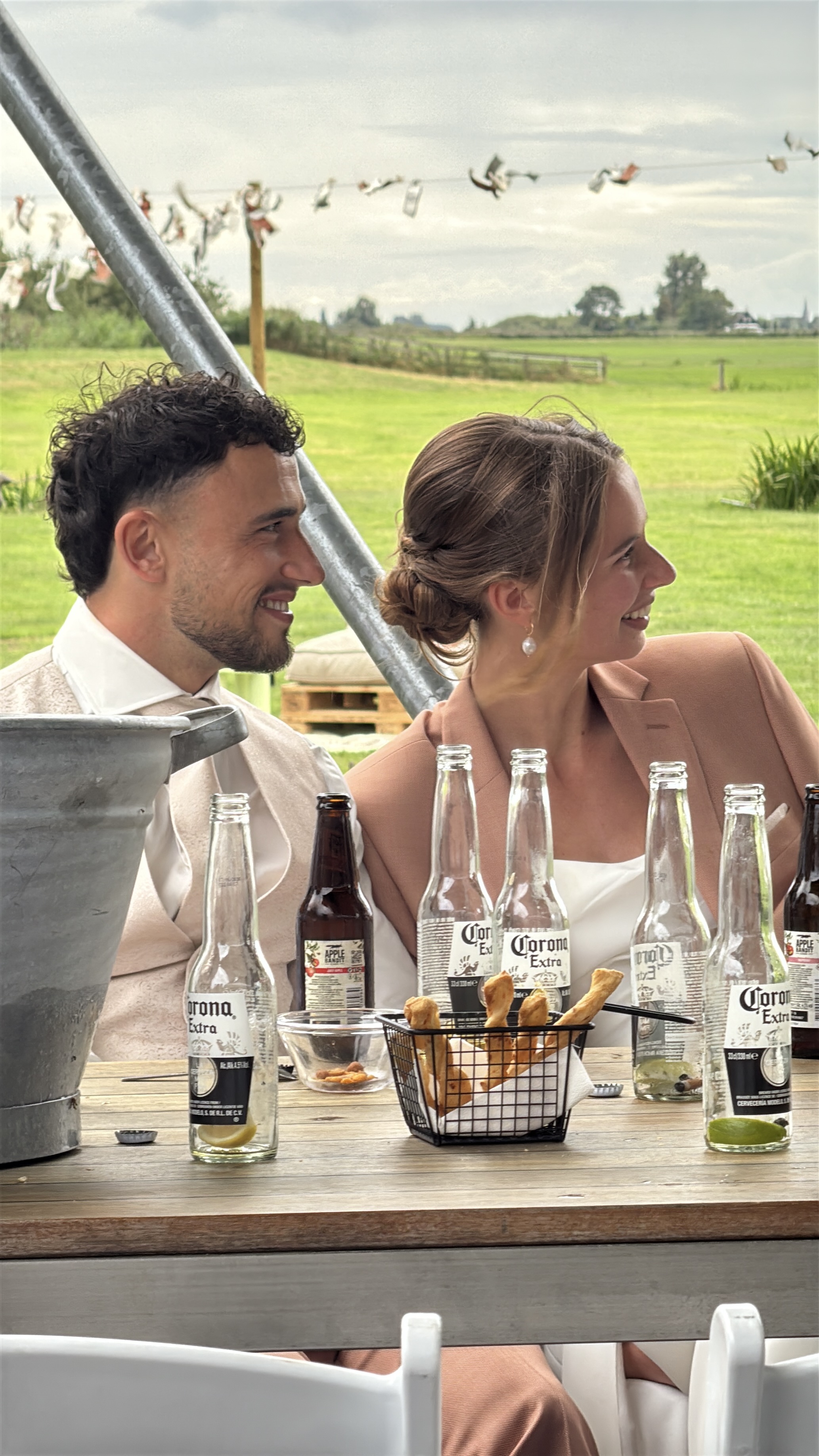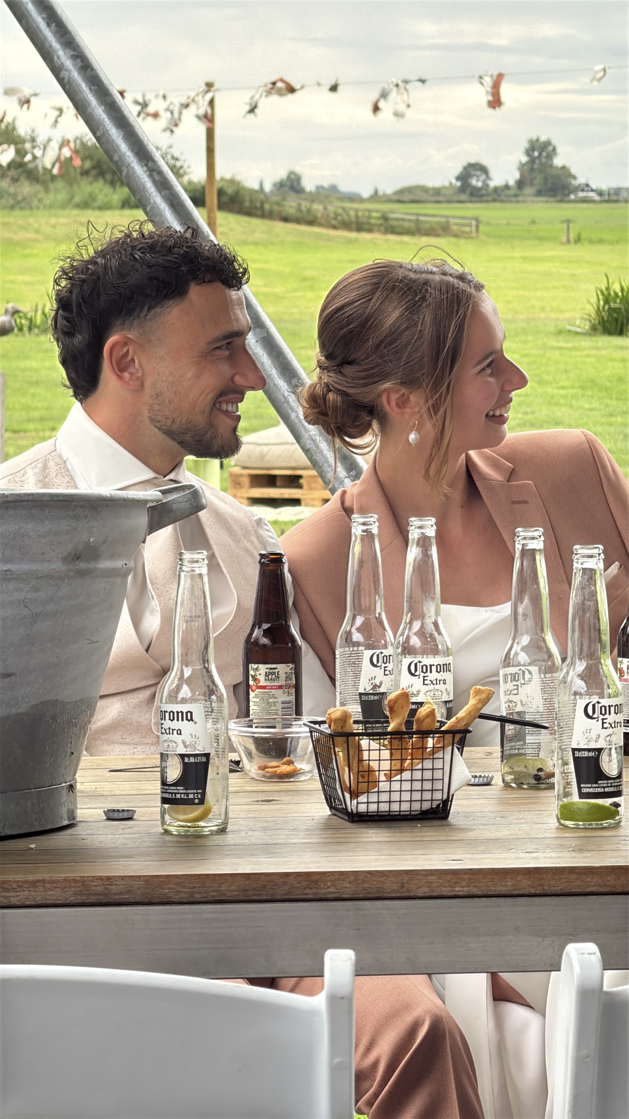 Onze bruiloft wordt een feest vol warmte, gezelligheid en stijl – een perfecte mix van festival vibes en chique details. Denk aan zachte aardetinten, warme perziktinten en natuurlijke groentinten, gecombineerd met romantische pastelkleuren. Alles komt samen in een ontspannen, elegante sfeer waarin iedereen zich vrij voelt om te genieten, te dansen en te vieren. Wil je qua kleding aansluiten bij onze stijl? Ga dan voor zachte en warme tinten zoals roest, perzik, oudroze, saliegroen of mint. Geen felle kleuren of zwart-wit, maar een palet dat perfect past bij de natuurlijke en feestelijke setting van de dag. We kijken er enorm naar uit om dit bijzondere moment met jullie te delen!